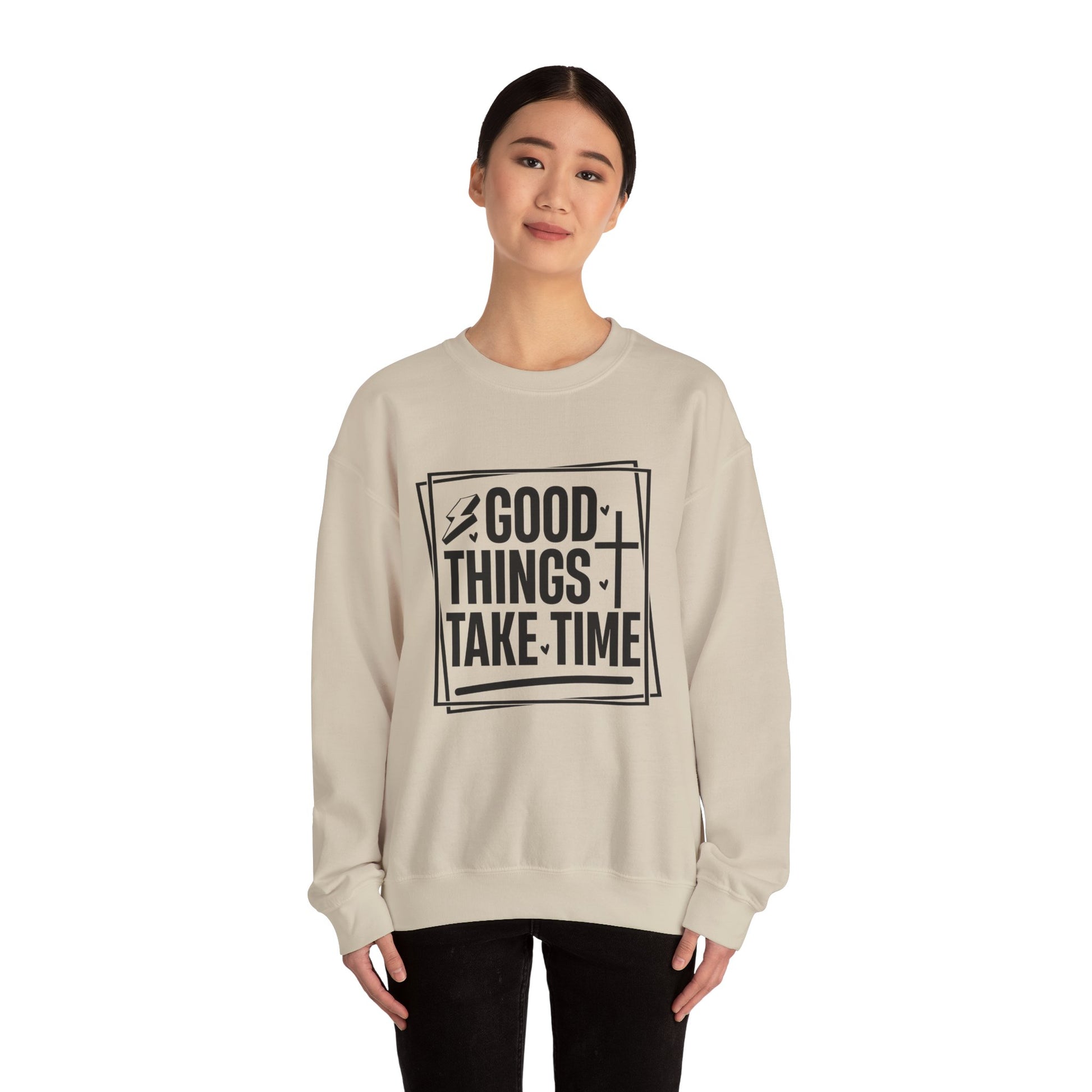 Crewneck Sweatshirt — “Good Things Take Time” Inspirational Graphic Pullover