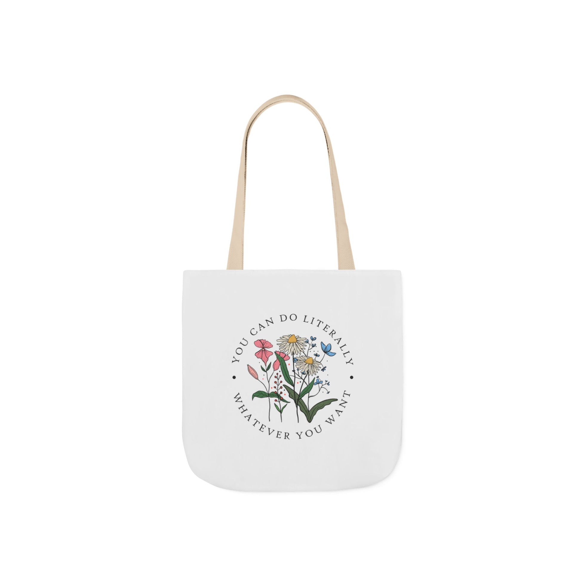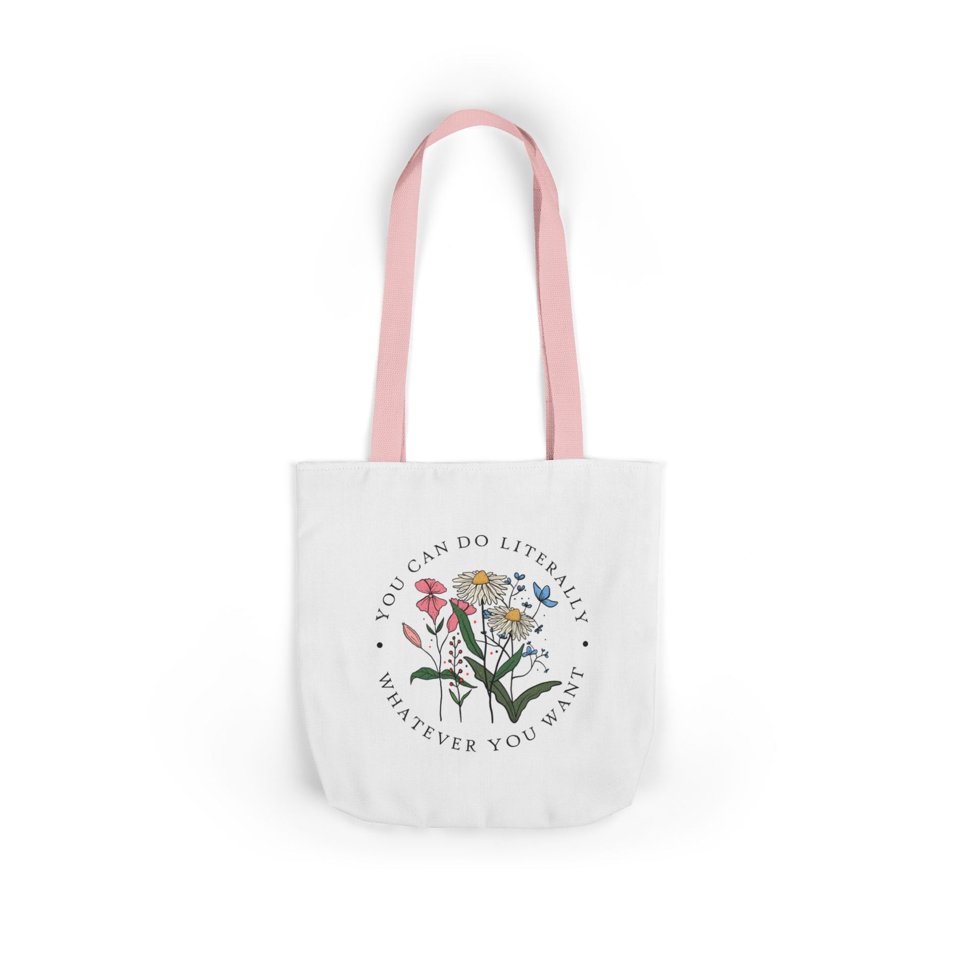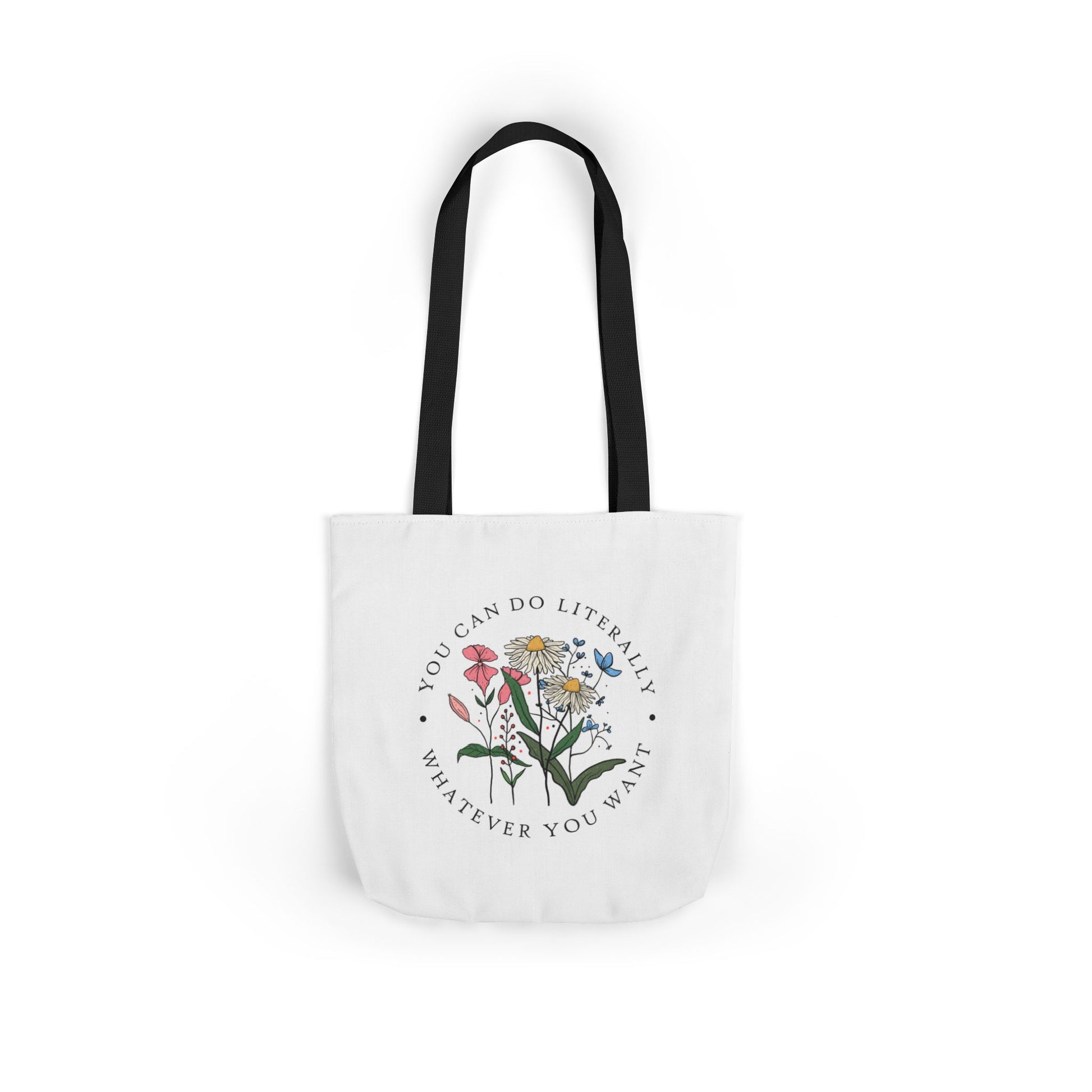 A lightweight canvas tote that brings a calm, botanical touch to everyday errands. The front displays a delicate wildflower cluster encircled by the encouraging phrase “You can do literally whatever you want,” printed with crisp, vibrant inks that stay true wash after wash. Boxed corners create roomy depth so groceries, notebooks, or a water bottle sit comfortably without bulging. The neutral black interior and five strap color choices let you personalize the look — from muted linen to bold contrast — while the fine-weave polyester canvas keeps the bag soft to the touch and easy to fold into a purse. Carry it to markets, classes, or weekend strolls when you want a subtle, uplifting statement woven into your daily routine.
