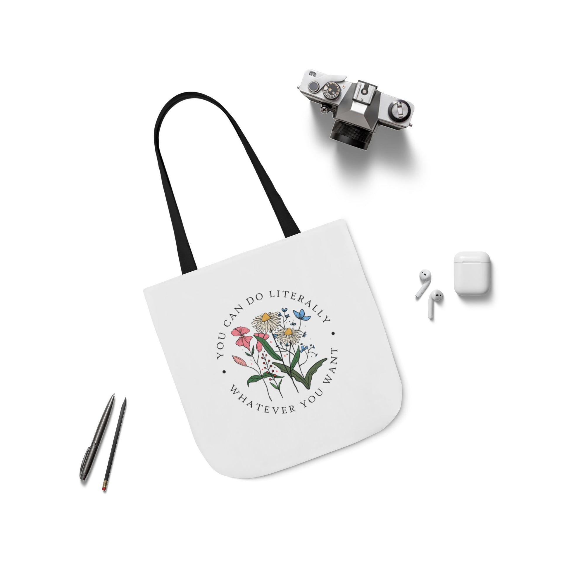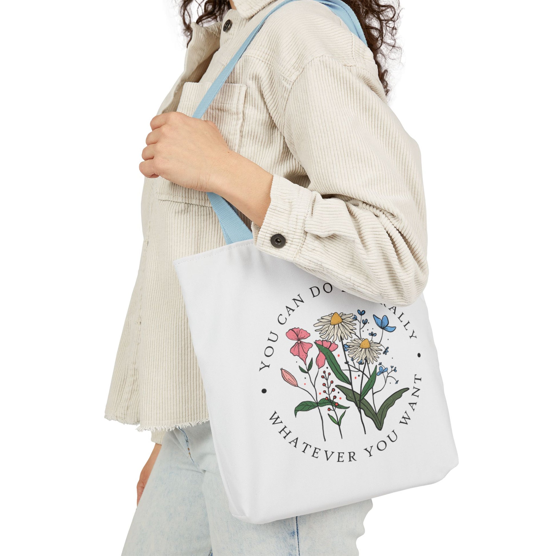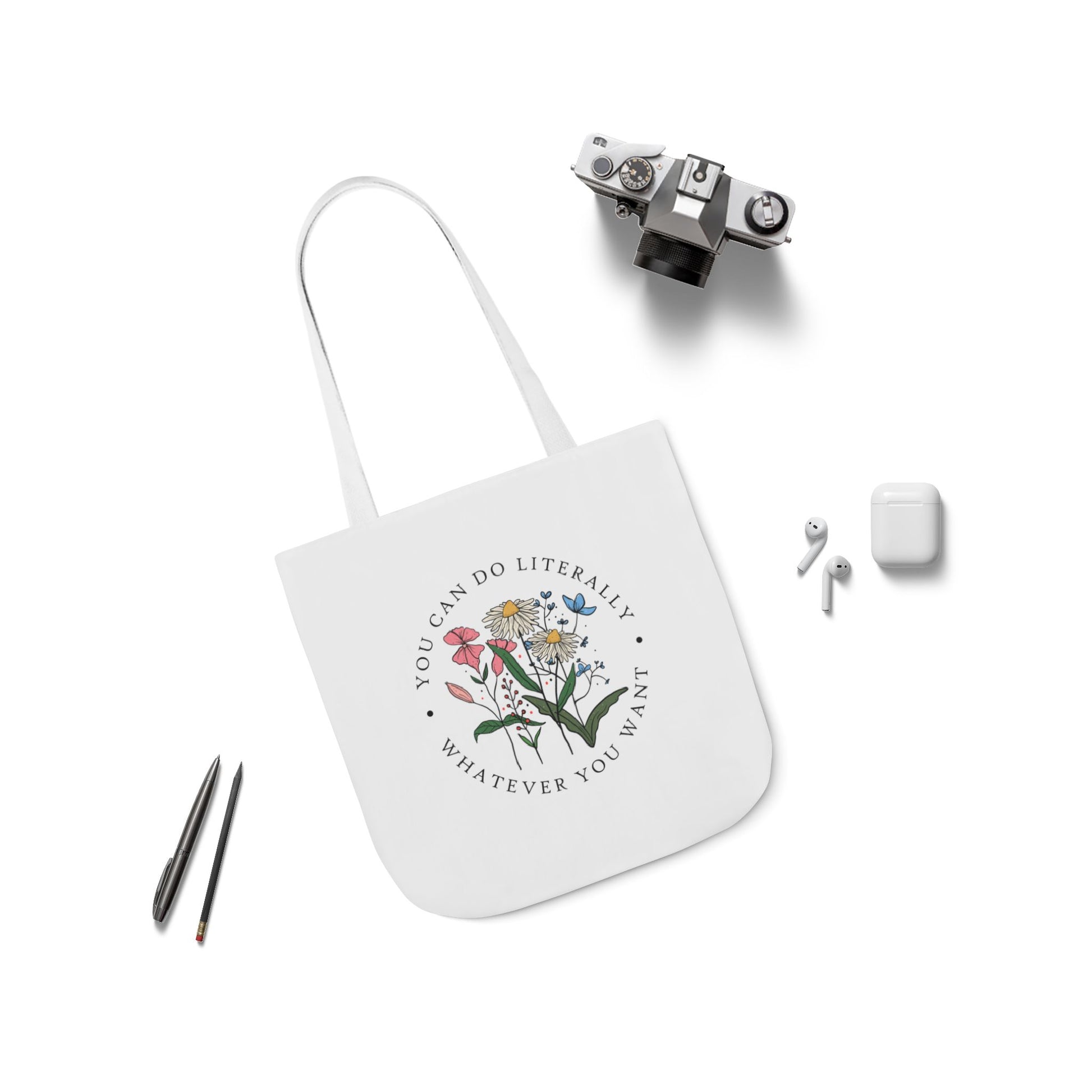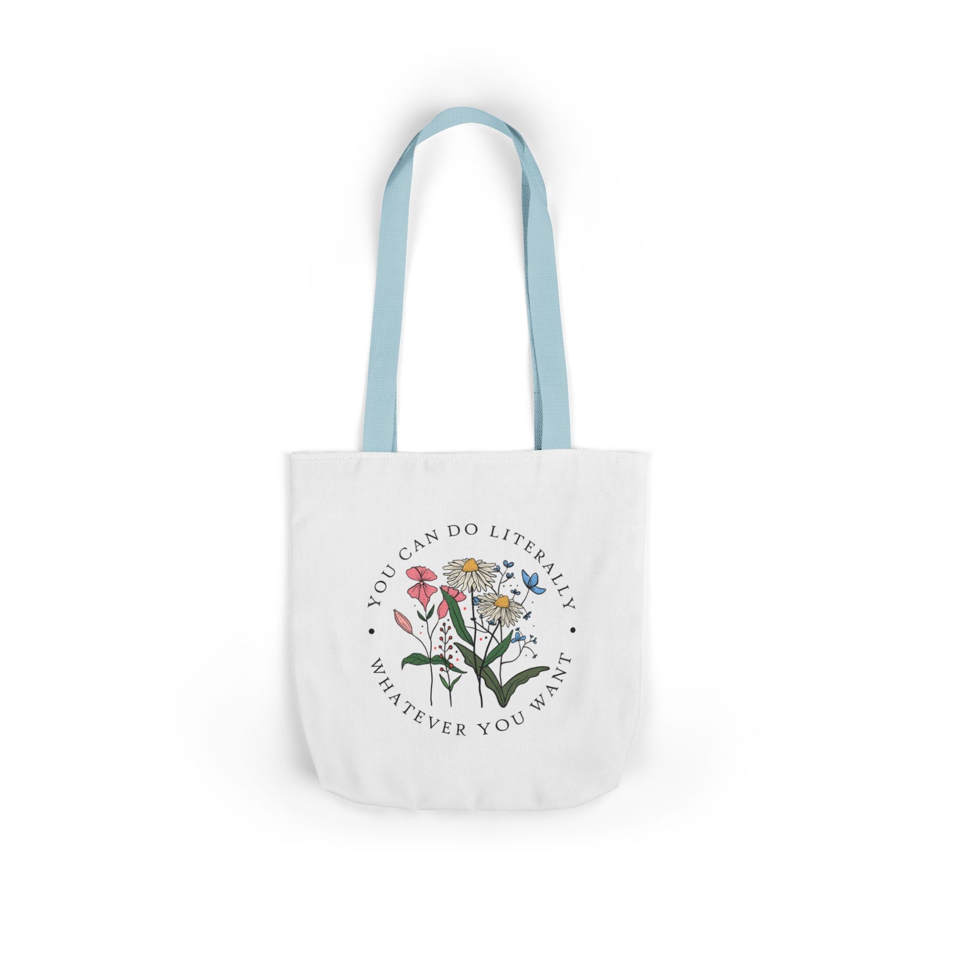 A lightweight canvas tote that brings a calm, botanical touch to everyday errands. The front displays a delicate wildflower cluster encircled by the encouraging phrase “You can do literally whatever you want,” printed with crisp, vibrant inks that stay true wash after wash. Boxed corners create roomy depth so groceries, notebooks, or a water bottle sit comfortably without bulging. The neutral black interior and five strap color choices let you personalize the look — from muted linen to bold contrast — while the fine-weave polyester canvas keeps the bag soft to the touch and easy to fold into a purse. Carry it to markets, classes, or weekend strolls when you want a subtle, uplifting statement woven into your daily routine.