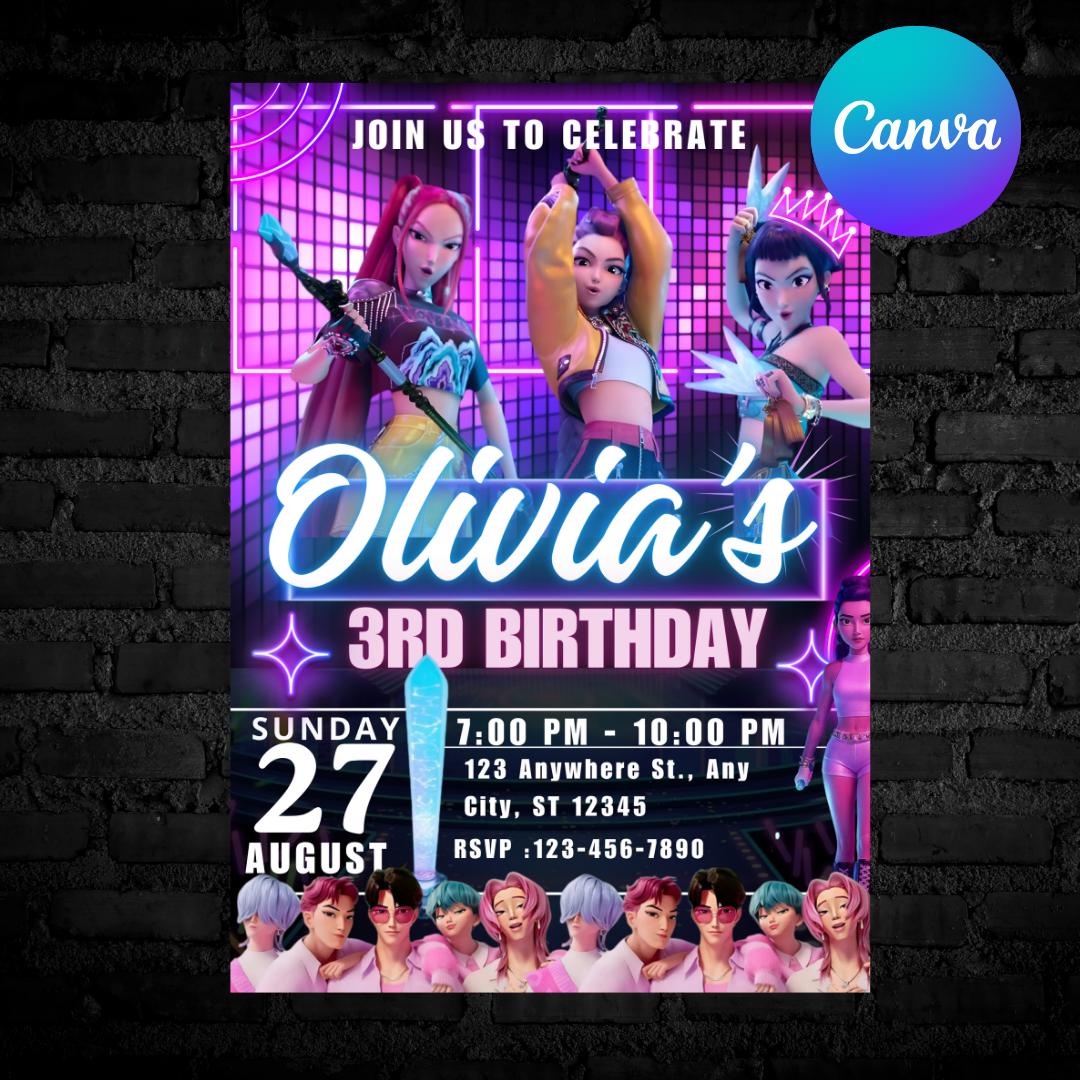 Kpop Demon Hunters Birthday Invitation, kpop theme demon hunter party, editable party invite, demon huntrix birthay party decor for fun IV