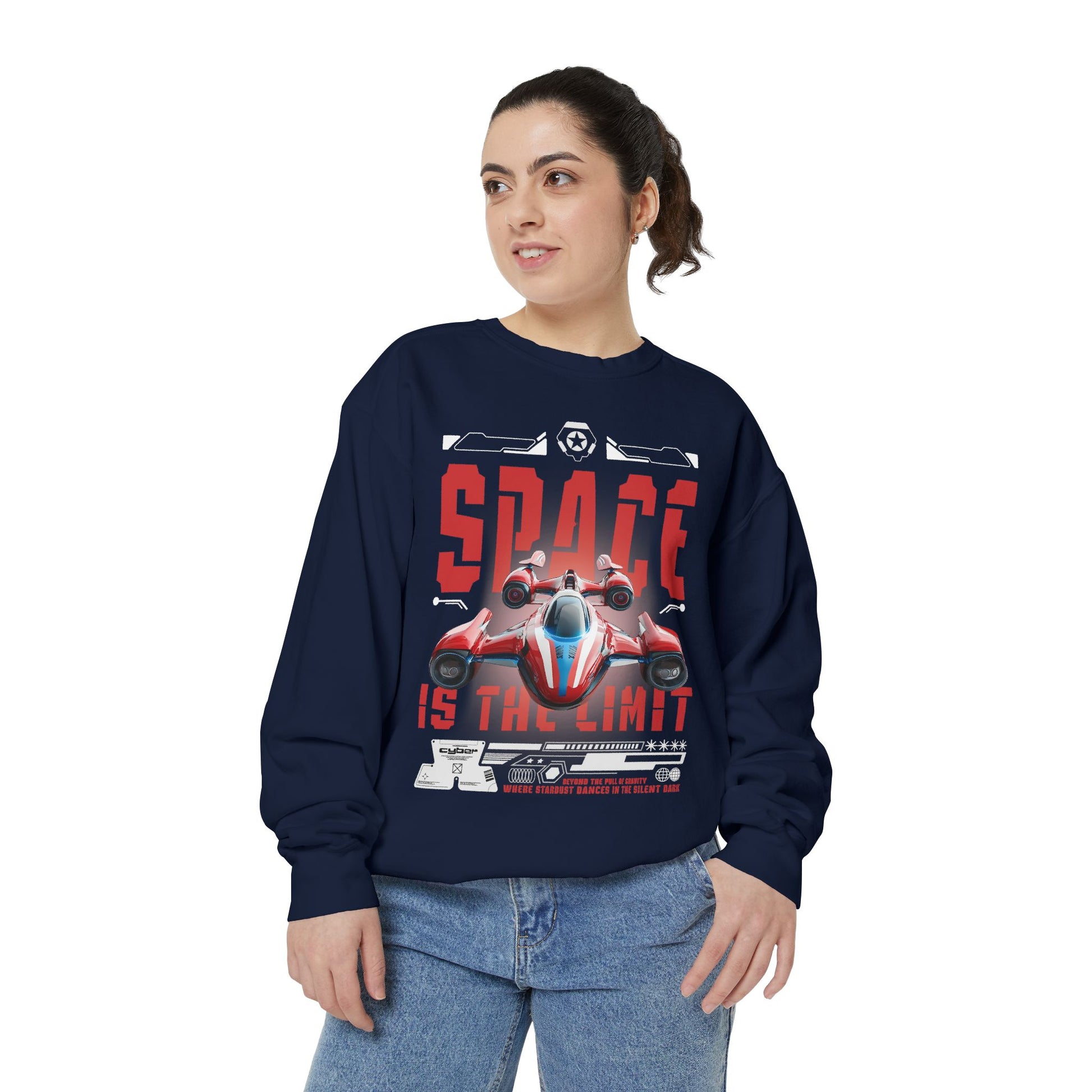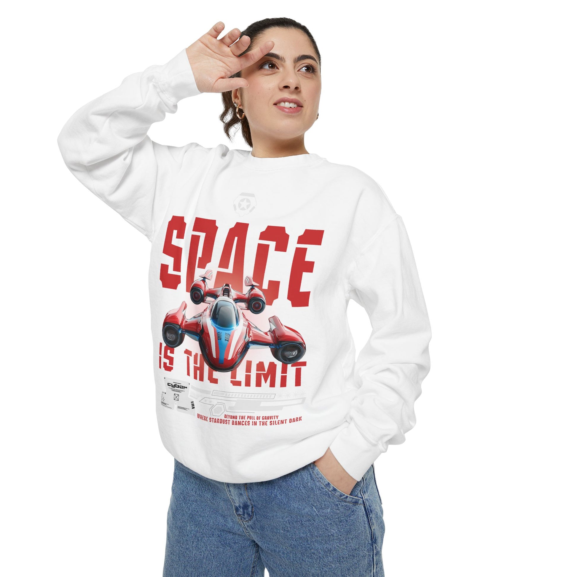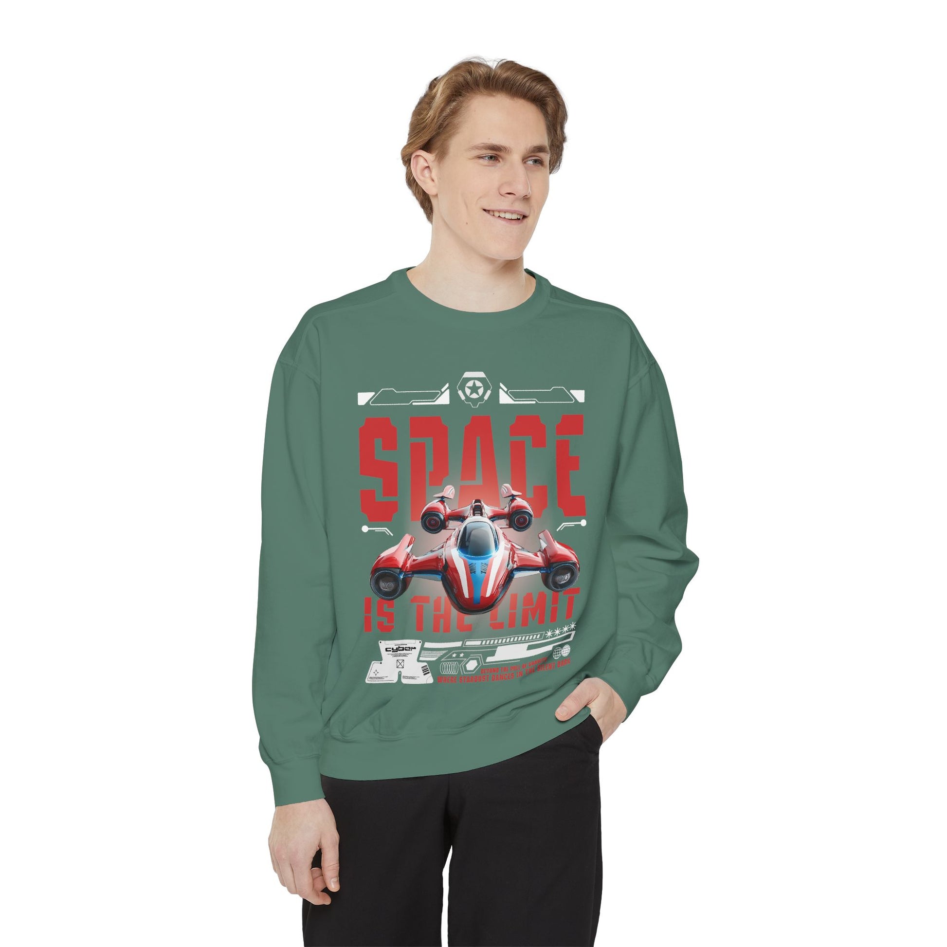 Slide into something that feels worn-in from day one. This garment-dyed sweatshirt carries a bold, retro-futuristic print—an arcade-style racing starship and distressed 'SPACE IS THE LIMIT' lettering—that reads like a personal badge for anyone who grew up loving sci-fi weekends and late-night game marathons. The fabric is midweight and soft, with a relaxed drape that makes it easy to layer over tees or hoodies. Little details—twill neck tape, ribbed cuffs and hem, and a half-moon back patch—keep the fit comfortable and stable through repeated wear. Embroidered options are available on the chest if you want a subtle textured accent instead of—or alongside—the printed artwork. It wears like a piece of nostalgia and performs like a reliable everyday layer, ready for road trips, convention days, or quiet evenings sketching starship designs.