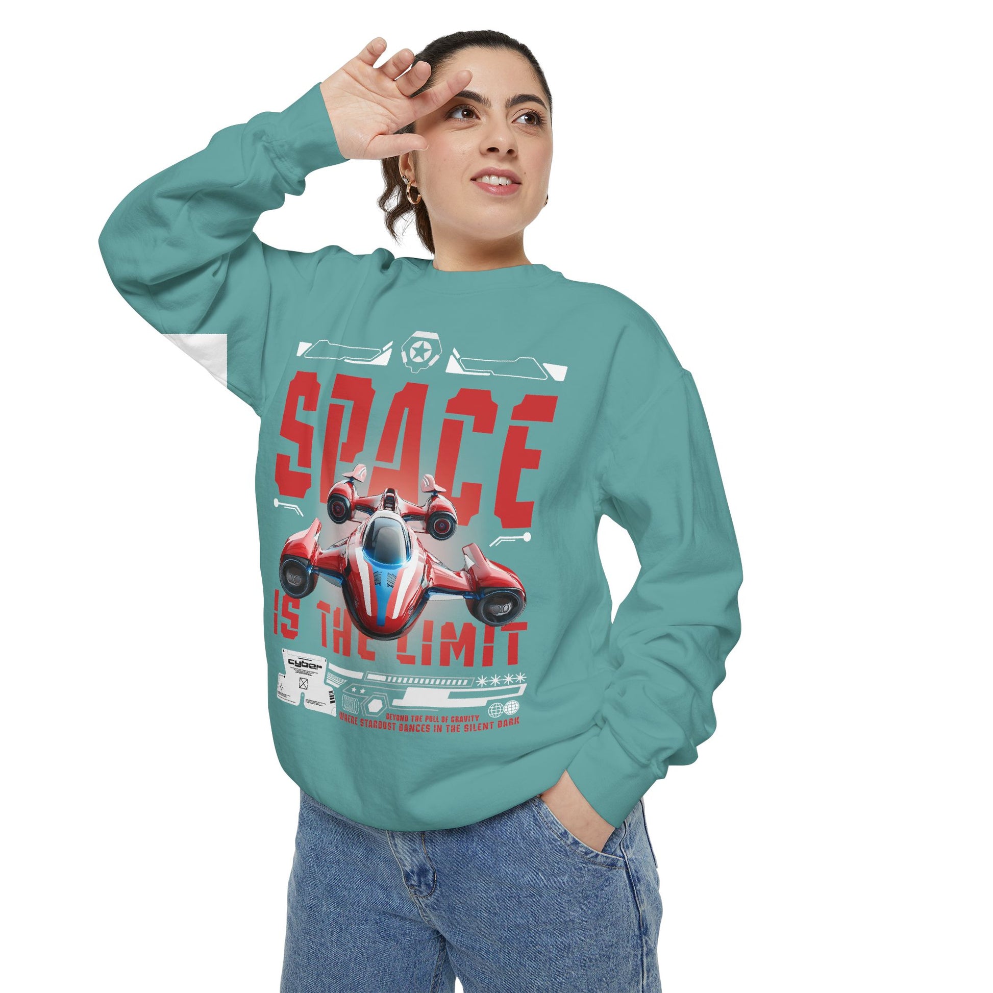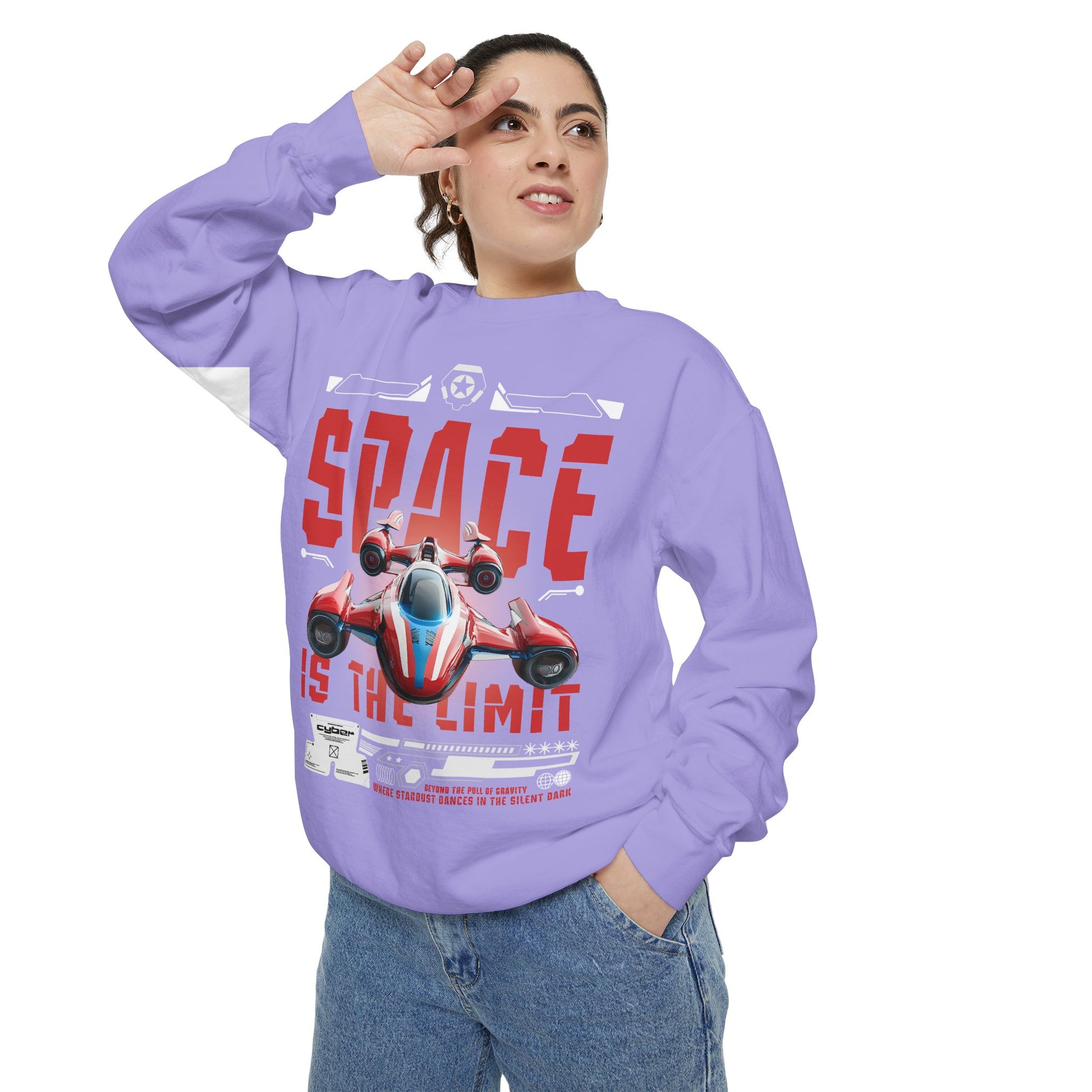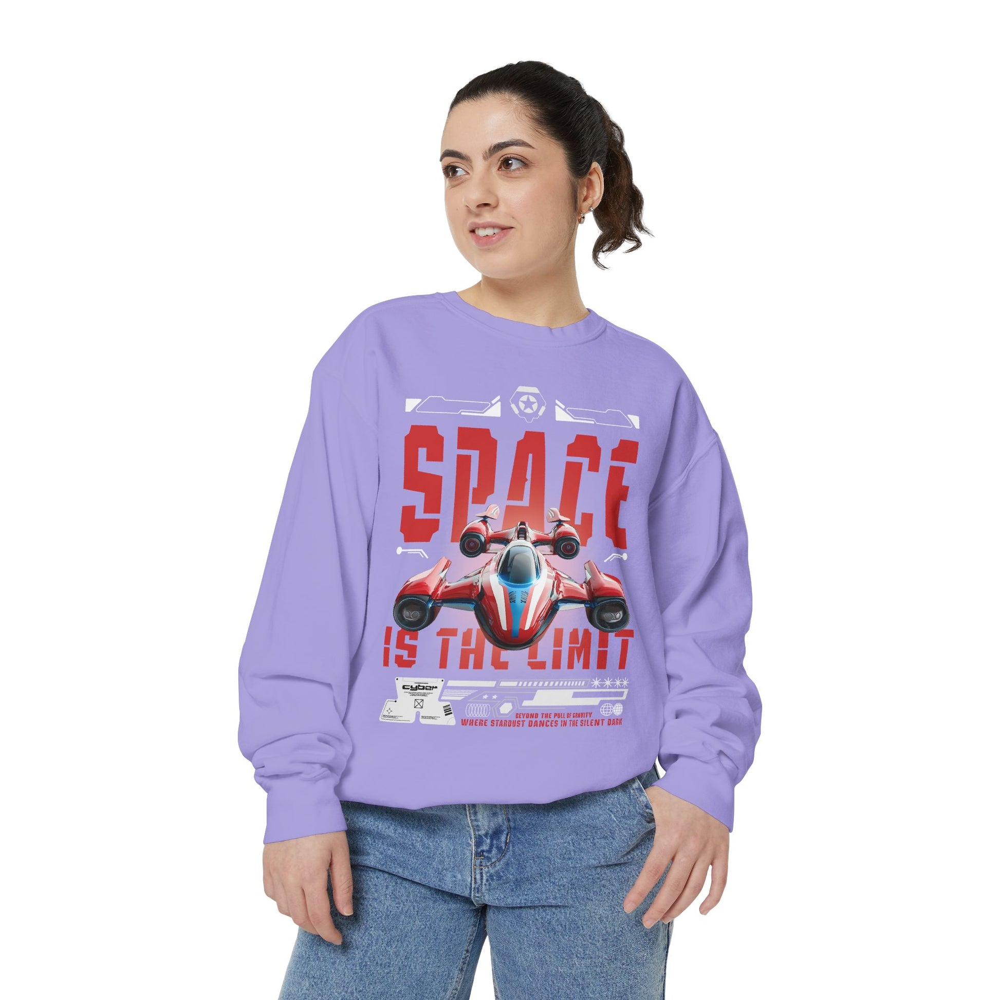 Slide into something that feels worn-in from day one. This garment-dyed sweatshirt carries a bold, retro-futuristic print—an arcade-style racing starship and distressed 'SPACE IS THE LIMIT' lettering—that reads like a personal badge for anyone who grew up loving sci-fi weekends and late-night game marathons. The fabric is midweight and soft, with a relaxed drape that makes it easy to layer over tees or hoodies. Little details—twill neck tape, ribbed cuffs and hem, and a half-moon back patch—keep the fit comfortable and stable through repeated wear. Embroidered options are available on the chest if you want a subtle textured accent instead of—or alongside—the printed artwork. It wears like a piece of nostalgia and performs like a reliable everyday layer, ready for road trips, convention days, or quiet evenings sketching starship designs.